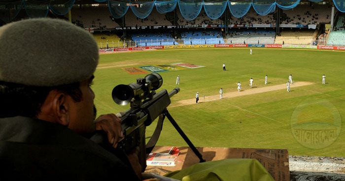আগে উপরের ছবিটা ভালো করে দেখে নিন। টেস্ট ক্রিকেট চলছে। একেবারে আন্তর্জাতিক ম্যাচ। তাহলে কে ওভাবে তাক করে রয়েছে আমেরিকান স্নাইপার?